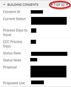 4. On the right hand side where it says 'Property Info' scroll down and open the 'Building Consents' tab. This will show any building consents for the property and what the current status is. This shows all the up-to-date status information. If you cannot find the right building consent number you may need to use the arrows to search through: